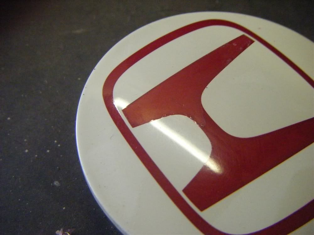 then had a look at the centre caps. my original plan was just to polish them up, as they didnt look bad. when i ordered the paint i had it matched to the centre caps as they were a slightly different shade from the wheel itself. but on closer inspection i found some of the red H areas had lacquer flaking. so a quick hunt on ebay found the correct decals to replace the red H and i've decided to paint these along with the wheels.