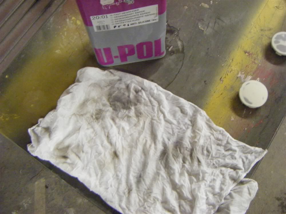 started off today by degreasing all the wheels and centre caps with UPOL degreaser panel wipe. this is the state of a clean white cloth after doing one wheel and shows why its necessary.