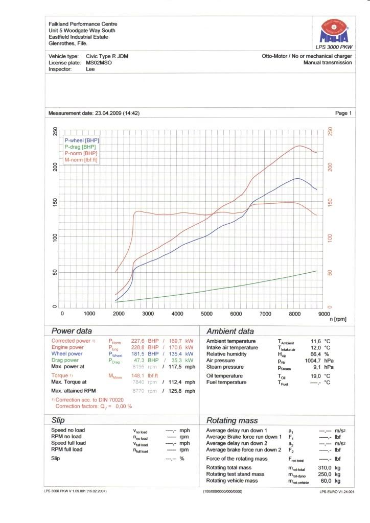 so to recap, yesterday on a dastek rolling road it made 246.5bhp @ fly, 205.7bhp @ wheels. today on a maha rolling road it made 228.8bhp @ fly and 181.5bhp @ wheels.