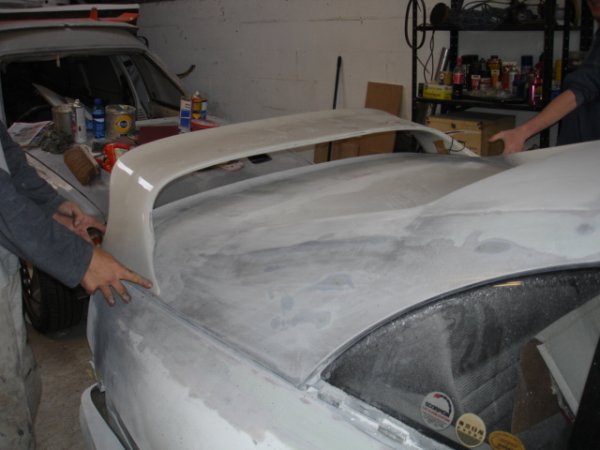 and the whole kit is fiberglass, wider rear arches, front wings, side skirts, front and rear bumpers and the rear windo panel bit