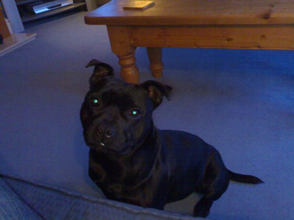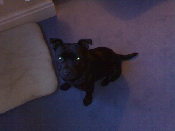 Shes a Staffordshire Bull Terrier called Billy, shes about 1 year old so still a bit of growing to do yet. Shes got a pedigree cos she came from a guy that enters them into shows. He mistreated her when she was younger though so shes a bit timid with new people.