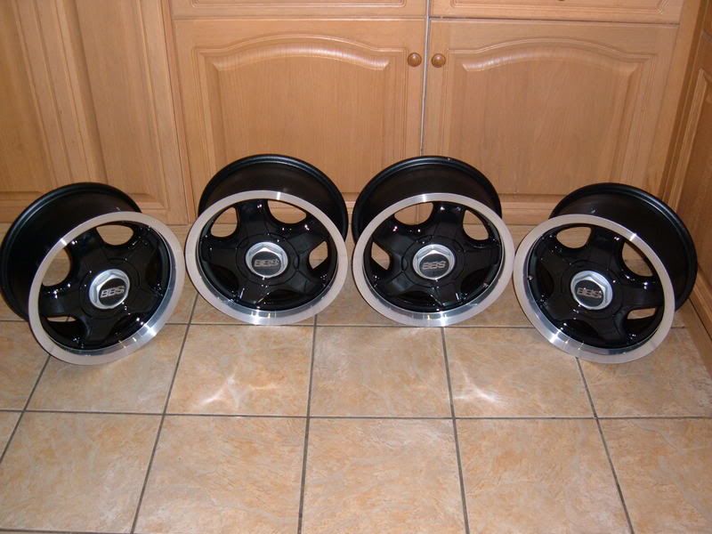 Set no1; 6.5x15", et30, 4x100pcd. Rotec Dynas?? (thats whats stamped on the rear of the rims!!). full pro refurb in black powdercoat with a diamond cut & laquered rim. Awesome looking rare wheels, finished with a set of BBS center cap emblems. As new condition, looking for offers around £320ono
