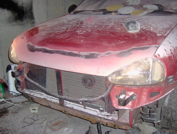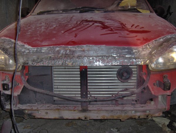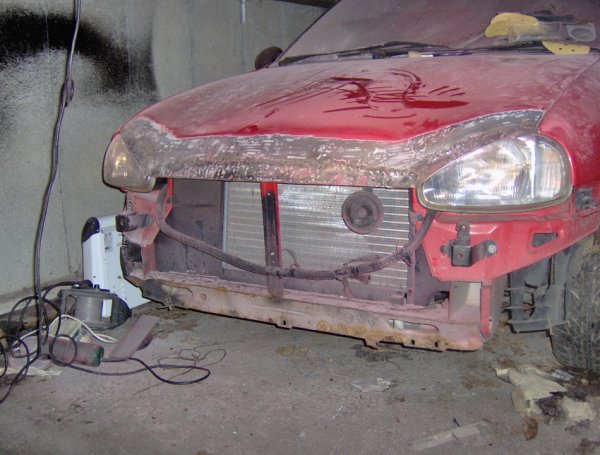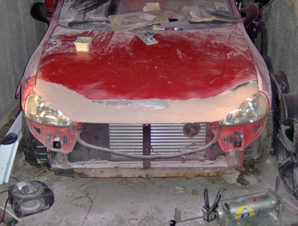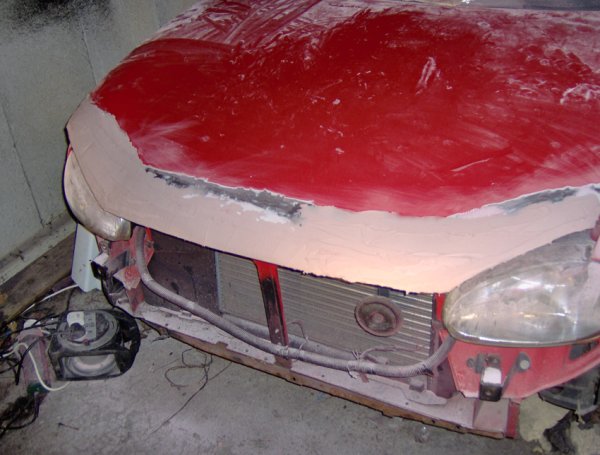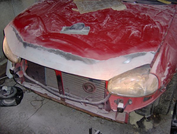 Hey all, right......I was browsing through the classified section when i came across a lad called Iain M, who wanted a Bad-boy bonnet with an extended front lip. At the time he was asking someone else to make him one but the guy never got back to him...so i offered to make it for him....we agreed on a price and here are some pics of it from saturday night....the first night i worked on it after a couple of hours. O by the way he wanted it spraying Vauxhall Flame Red aswell(all in the price)....which is going to be done tomorrow at work.