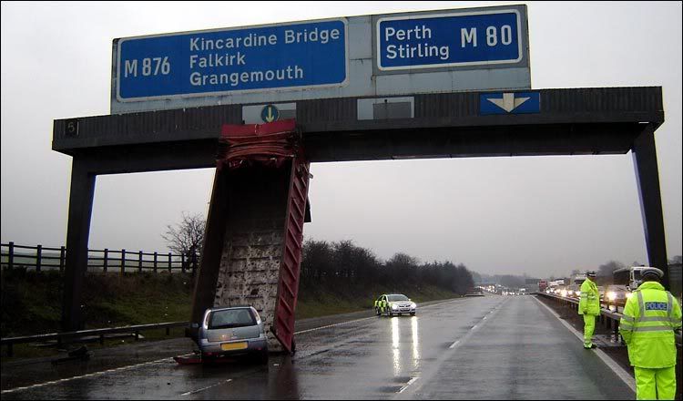 It was in The Sun yesterday. Apparently the trailer thing lifted up in the wind, hit the sign and was ripped off the truck. It then landed on that corsa's bonnet