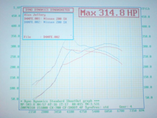 also if you are running the standard turbo it will be at its limit on power with out running it to hard all the time but that is i realy good result. The 200sx is a good car to get power out of the sr20det engine for little money