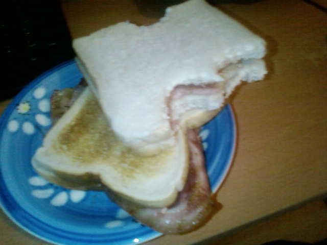 Bacon and bean roll. bacon with a shit lot of beans over the top Or if I'm really hungry... Bacon, 3 link sausages, one sliced sausage covered in beans