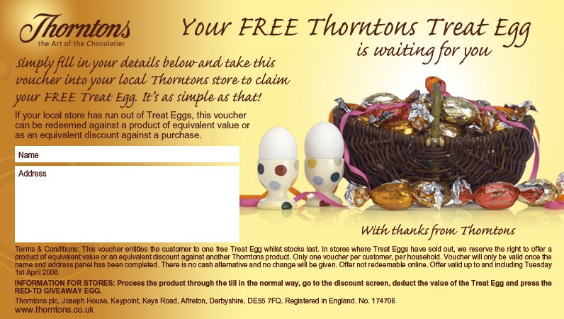 Due to high demand our free Thorntons Treat Egg offer has been oversubscribed. We do however still have stock in stores and don't want you to miss out on your delicious treat. Therefore please find attached a voucher to take into your local Thorntons store to redeem your Treat Egg. In the eventuality that your local store has run out, they may substitute this for an alternative product of equivalent value.