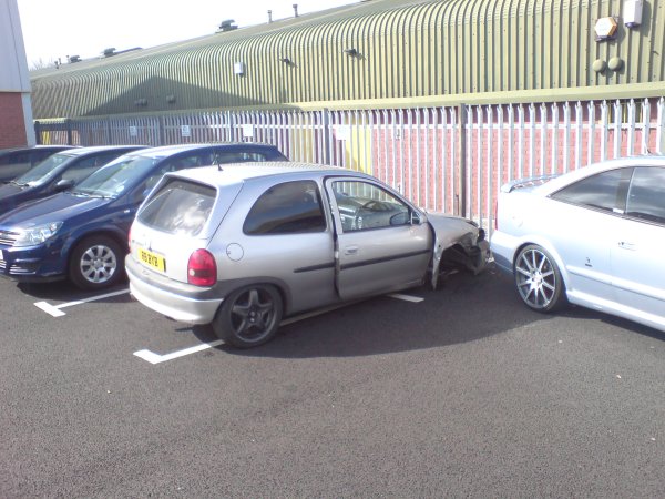 most will know it as Rob-B's old start silver corsa. It was crashed into a van this morning and is now a write off for sure, chassis is completely bent on the front drivers corner: