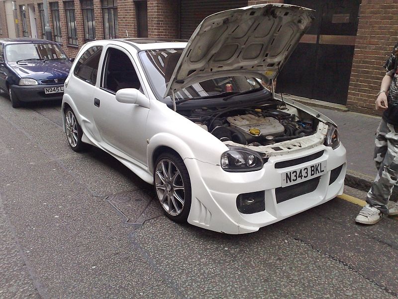 Was driving round Birmingham center when I spotted this white Corsa and thought, "That looks like my old bumper, that looks like my old side skirts, that looks like my old wheels!......" So went after the chav and starting flashing him (with my headlights) got him to pull over. So strange seeing it again. I'd heard it'd been written off. Its over 3 years since I sold it and god is it in a state. Shame because even though it looks dated nowadays, I loved that car and spent a fortune on it and it looked mint when I sold it. The wheels alone were £800 Best of it was the kid who I sold it to told him it had a 'GSi engine in it' Unless he swapped the rocker cover, induction kit and other bits over, I'd say it's the same old X14 lump. Didn't wanna piss on the kids fire though
